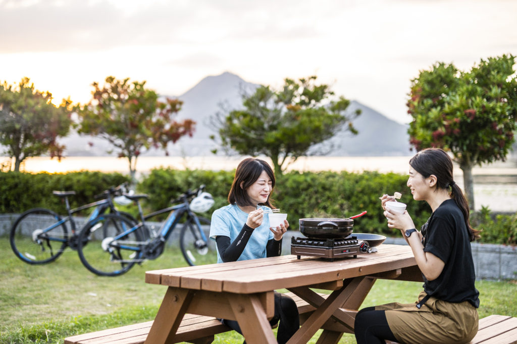 サンセットキャンプから始まり、朝日を見ながらのサイクリング、そして特産品のかんきつジビエやレモンポークなど、上島町の食と自然が思いっきり楽しめるツアーになっています!