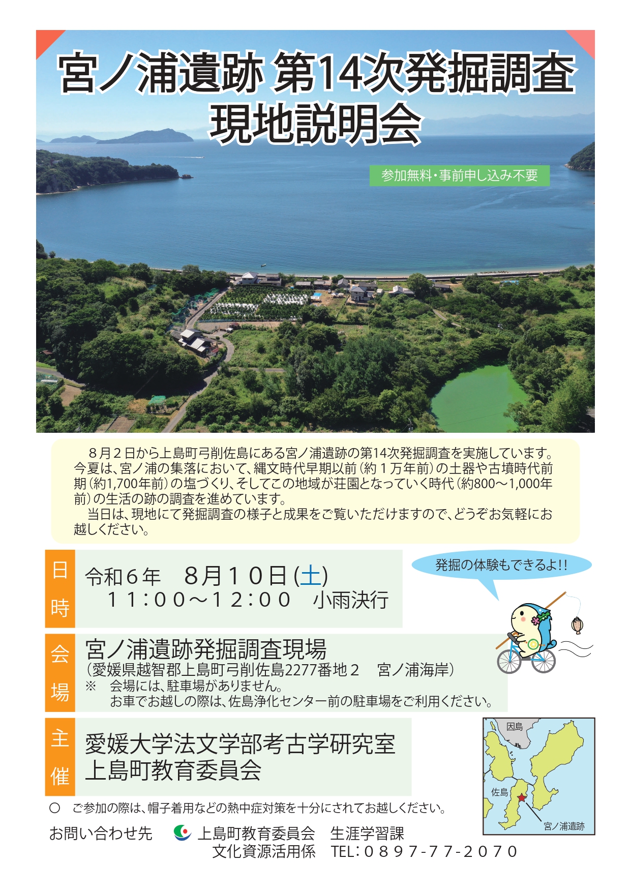 8月2日から佐島の宮ノ浦遺跡で愛媛大学法文学部考古学研究室と上島町教育委員会による第14期発掘調査が実施されています。