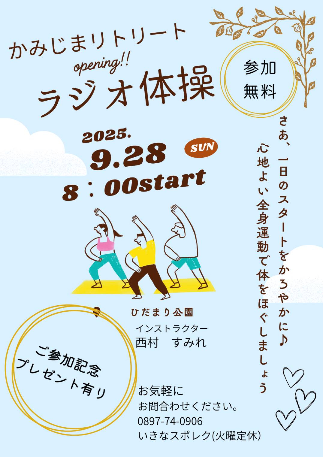 全国ラジオ体操連盟公認2級ラジオ体操指導士の資格を持つ西村すみれ先生と一緒に、リトリートDAYのスタートを切りましょう。