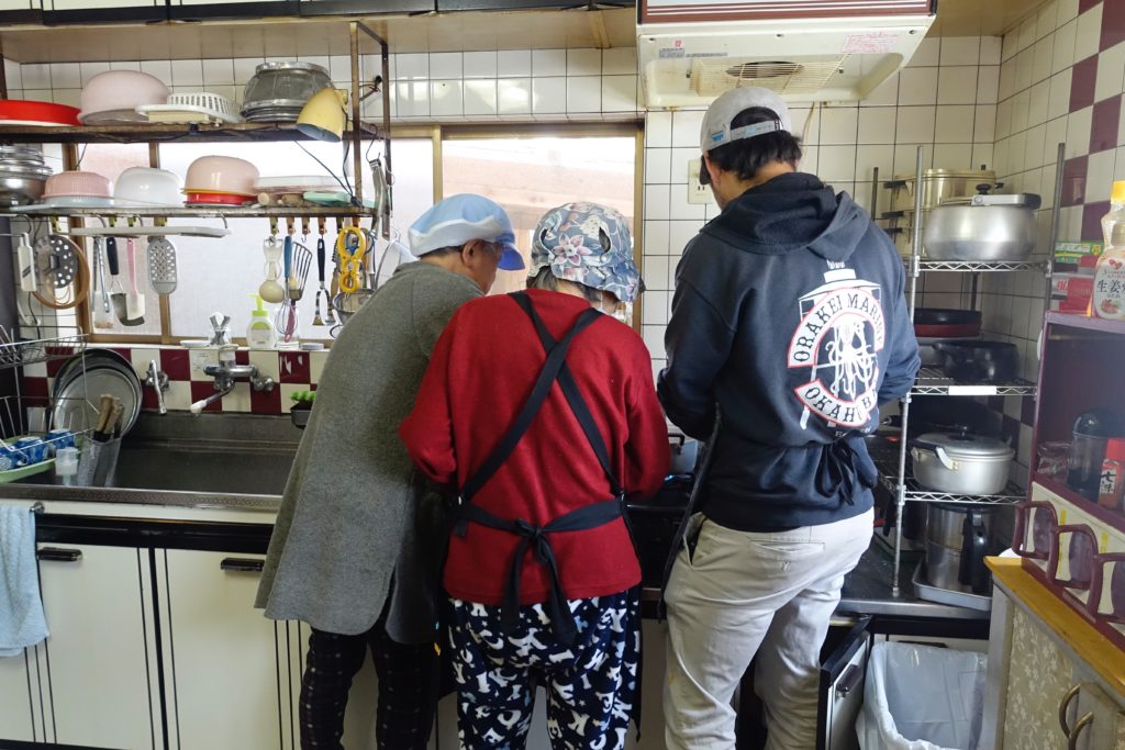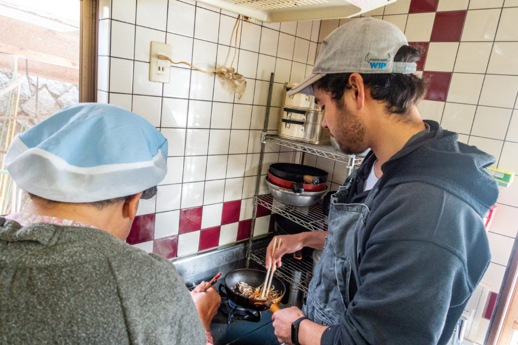 おばちゃん達に教わりながら次にいりこをを炒めて、しゃりしゃり感を出すために炊いていないひじきを合わせマリネにしていきます