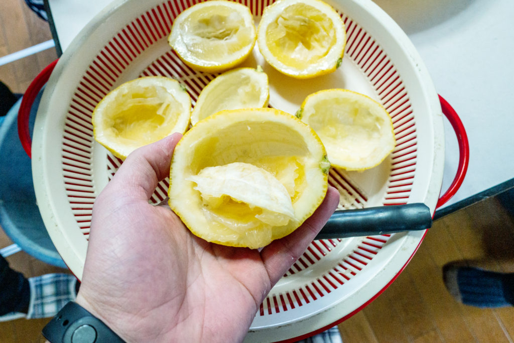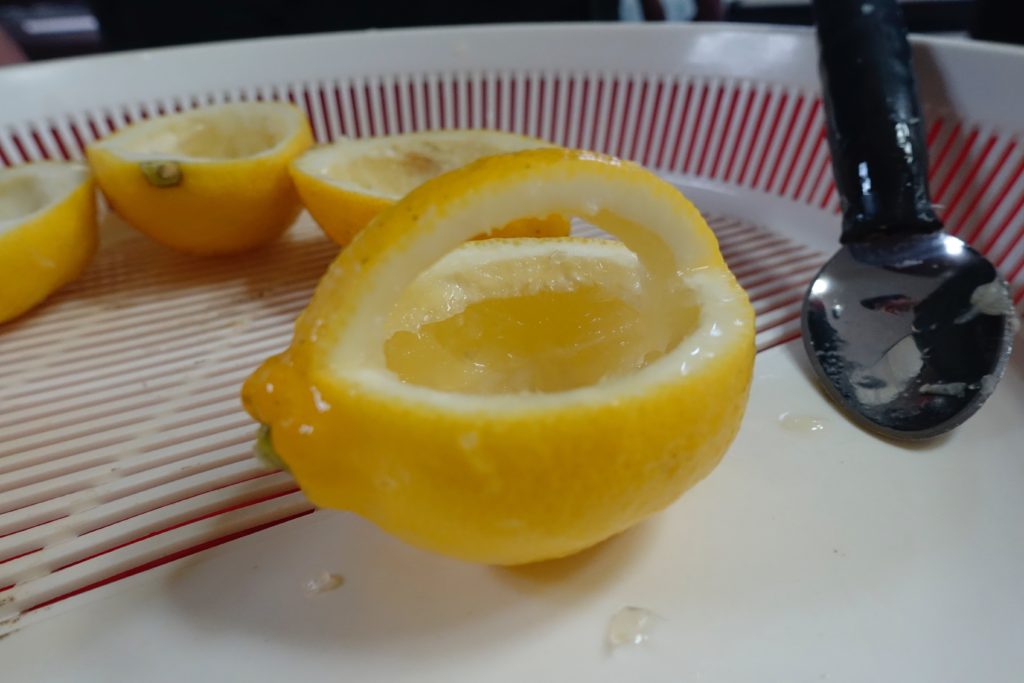 搾ったレモンは器にするためスプーンで中身を整えます。