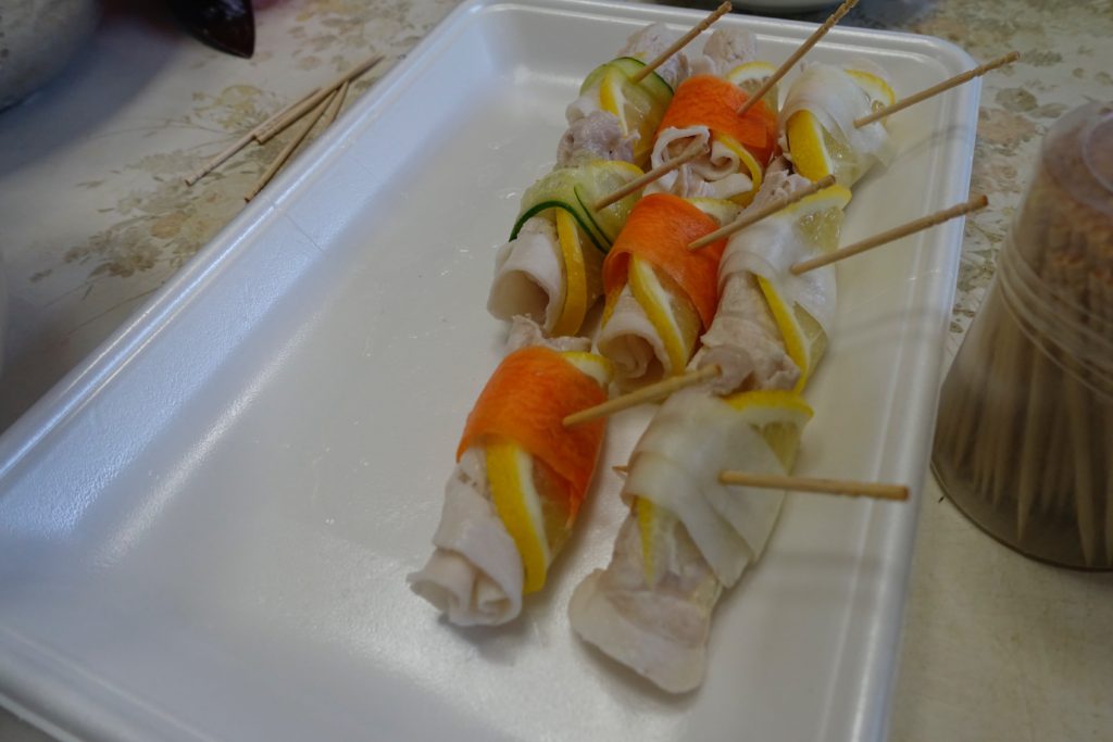 レモンポークに薄くスライスしたレモンやスライスされた大根や人参、胡瓜を巻いて爪楊枝でさして出来上がり!