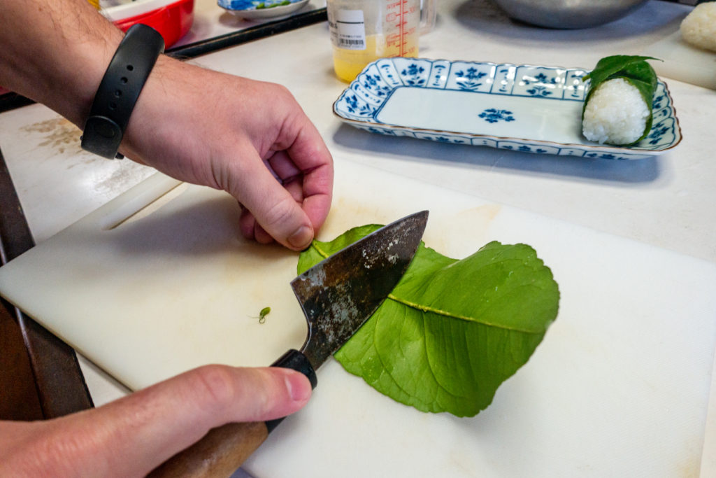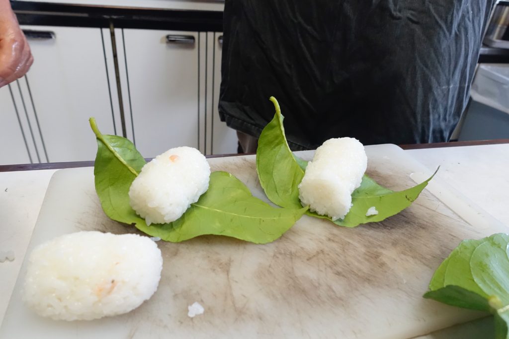 俵型にしたご飯にレモンの葉っぱを巻いていきます。