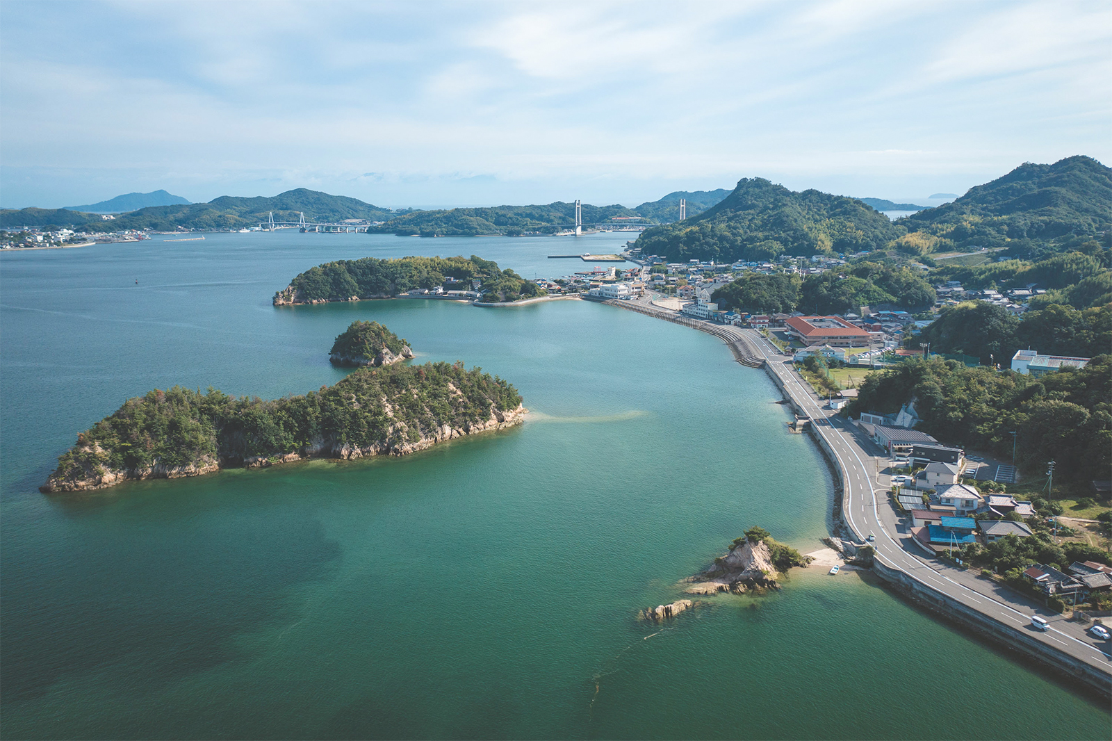 港の桟橋を背に海沿いを左に折れれば、弓削島・佐島へと向かっていく広々とした県道が続き、そこからまるで並走しているかのように海上に並ぶ、3つの小島を間近に見ることが出来る。立石港側から順に、