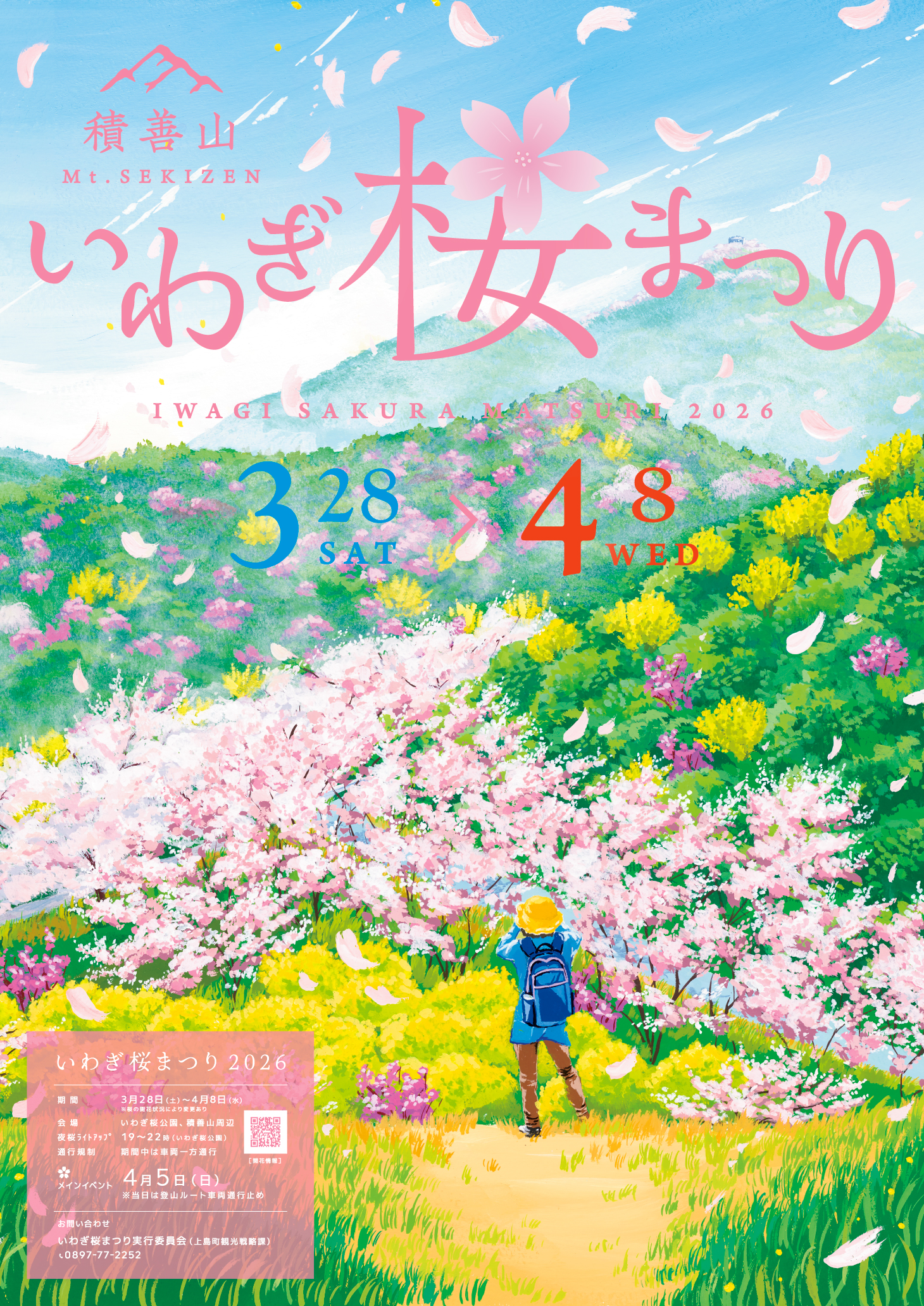 ソメイヨシノや大島桜、陽春などが満開に咲き誇る積善山三千本桜。「岩城富士」とも呼ばれ、山頂からは瀬戸内海の多島美を一望することができます。