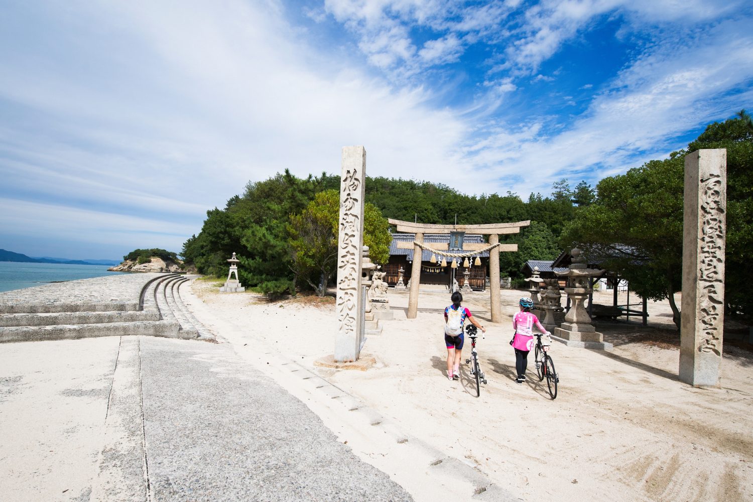 弓削島の上弓削地区にある神社。 隣接する高浜海岸は撮影等でもよく使用される、町内でも有数の綺麗な海岸です。 神社の裏には大潮の干潮時に歩いて渡れる離れ小島「京の小島」もありパワースポットとなっています。