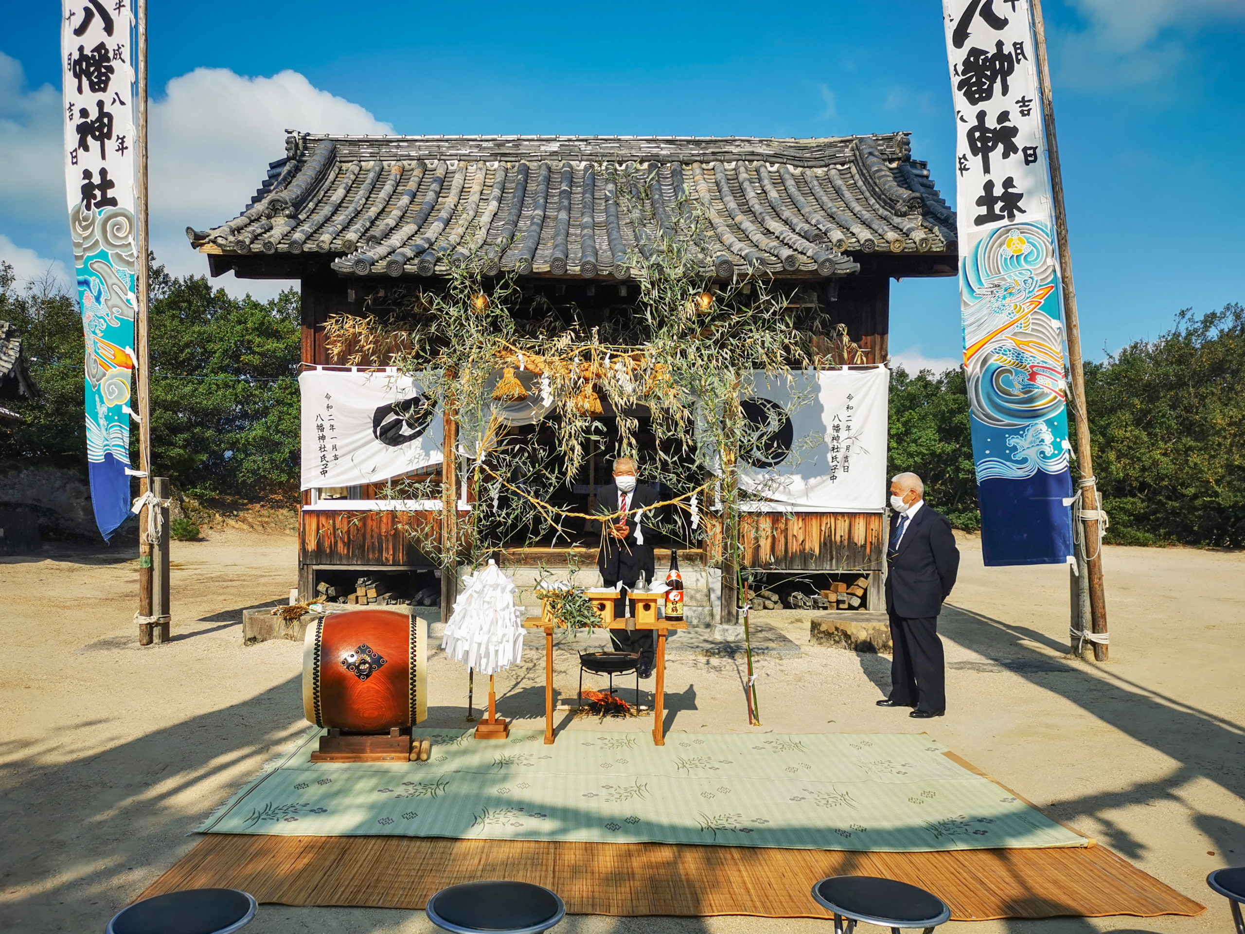 その昔、江尻地区元見山にあった八幡宮が本浦地区に移転後、更に現在の場所に移転されました。その頃は厳島神社の境内地であったが、いつしか八幡宮が中心になり、厳島神社は慶長4年(1599年)再建された八幡宮の本殿に向かって左側に鎮座されました。