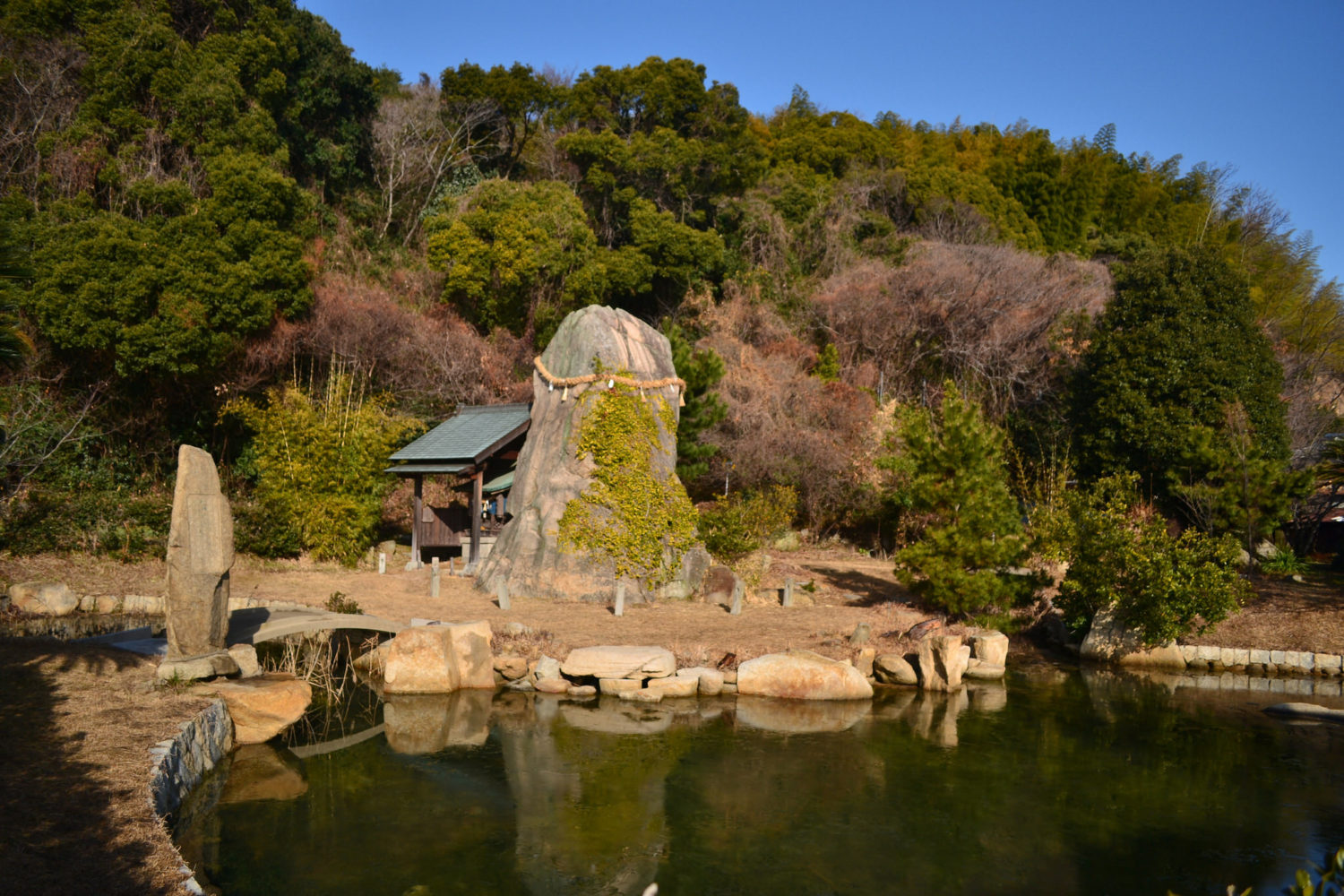 その三秀園の中央に、弥生時代から神さまとして大切にされたと言われている巨石(メンヒル)が立っています。